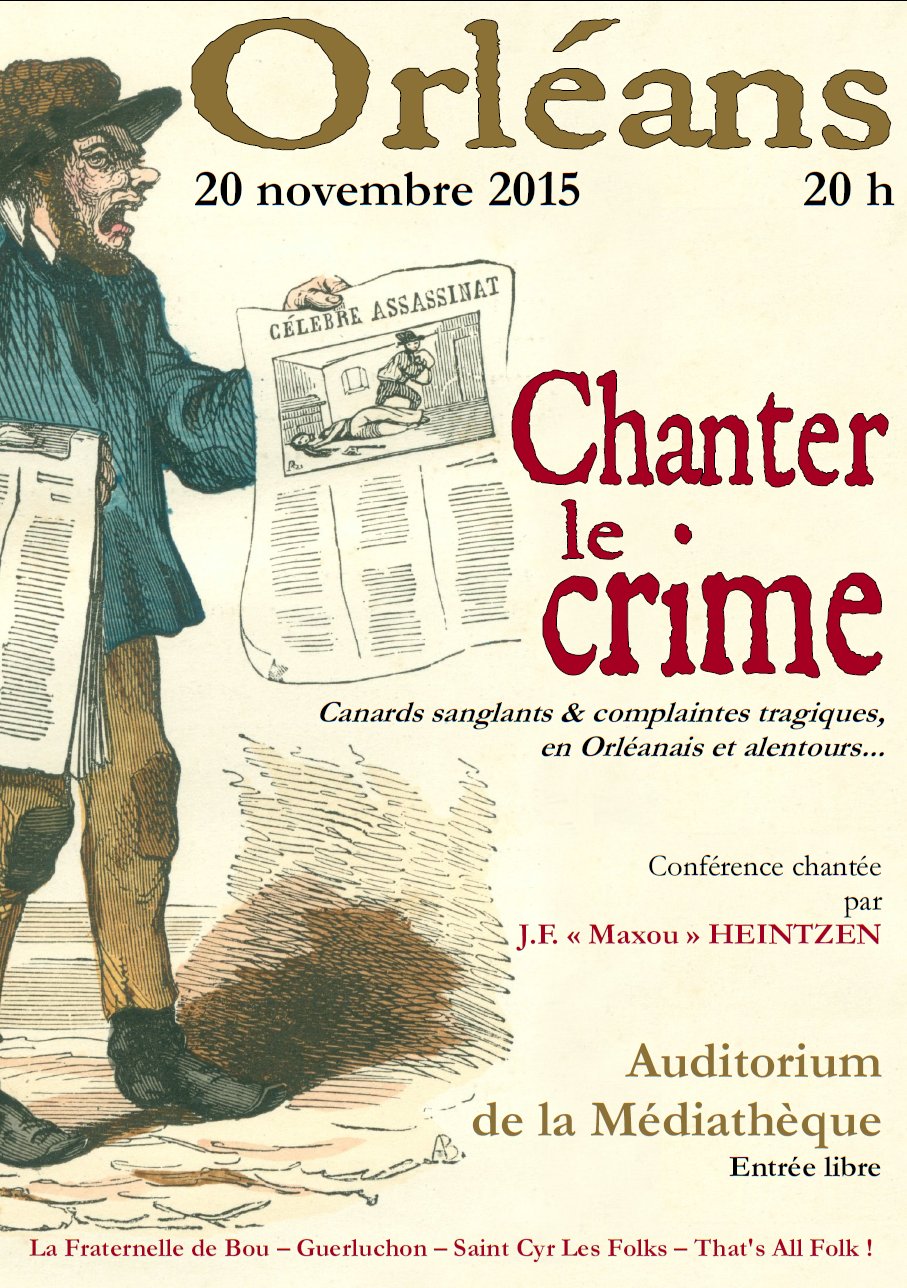 Jean-François Heintzen nous a présenté, le 20 novembre 2015, une conférence chantée intitulée "Chanter le crime, Canards sanglants & complaintes tragiques, en Orléanais et alentours".